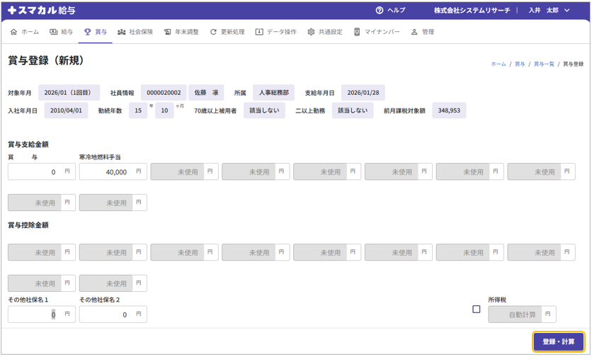 ③賞与登録(新規)で賞与データを入力し、入力内容に誤りが無いことの確認後[登録・計算]をクリックします。