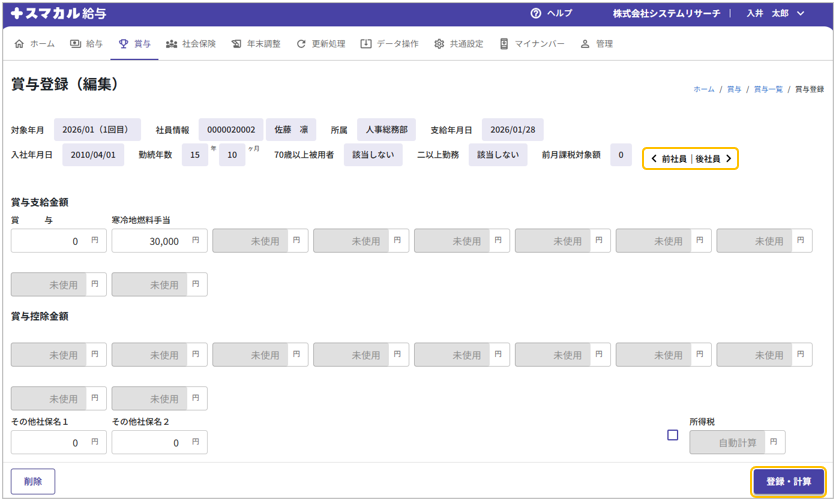 ③賞与登録(編集)で賞与データを修正し、[登録・計算]をクリックします。