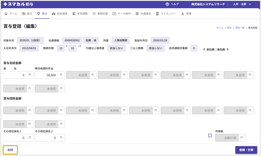 ③賞与登録(編集)で、画面下部の[削除]をクリックします。