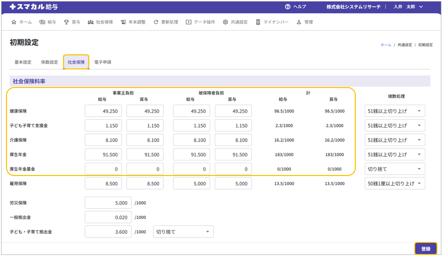 ②各保険料率を入力し、[登録]をクリックします。