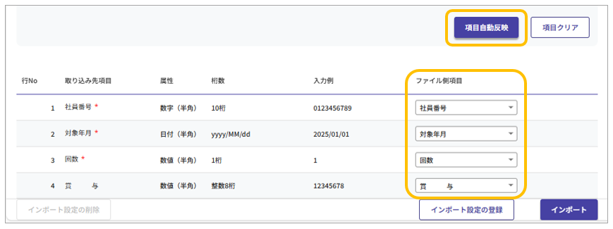 ●「ヘッダーレコード:含む」の場合(項目名で選択。項目名が完全一致ならば[項目自動反映]で紐付け可能)