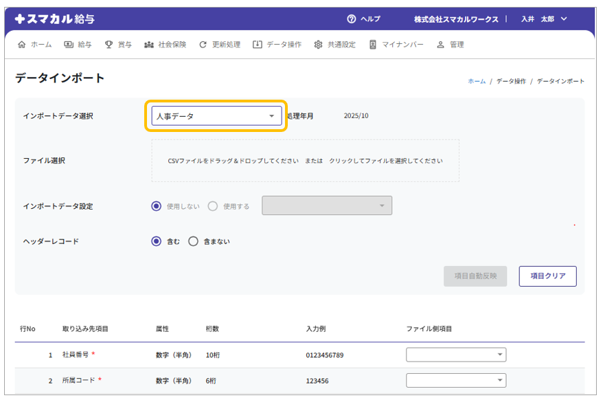 ①データ操作メニューから[データインポート]を開き、インポートデータ選択で「人事データ」を選択後、ファイル選択でインポートするCSVファイルを選択します。