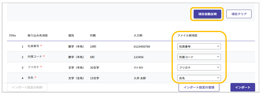 ●「ヘッダーレコード:含む」の場合(項目名で選択。項目名が完全一致ならば[項目自動反映]で紐付け可能)