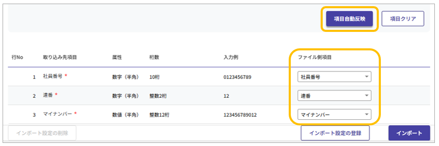 ●「ヘッダーレコード:含む」の場合(項目名で選択。項目名が完全一致ならば[項目自動反映]で紐付け可能)