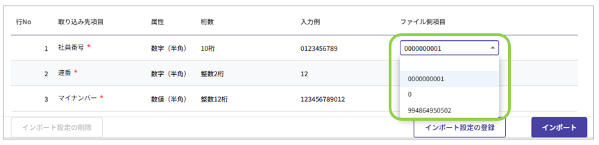 ファイル側項目 紐付けしたい項目の設定