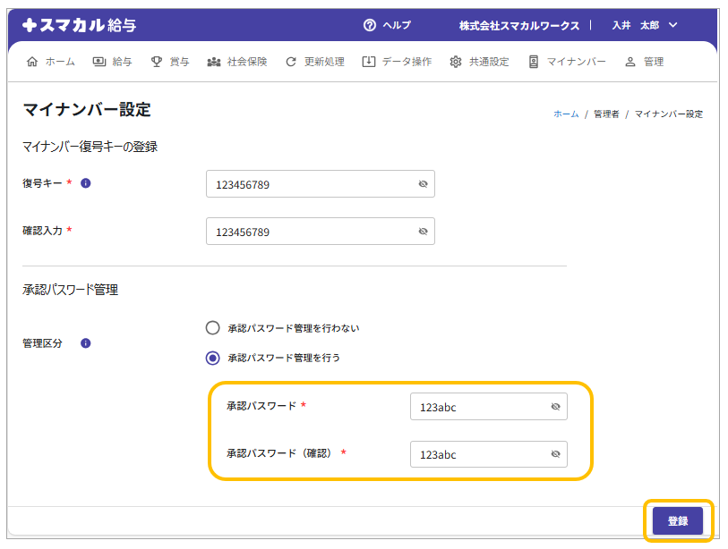 ●承認パスワードの設定には、マイナンバー復号キーの登録が必要です。