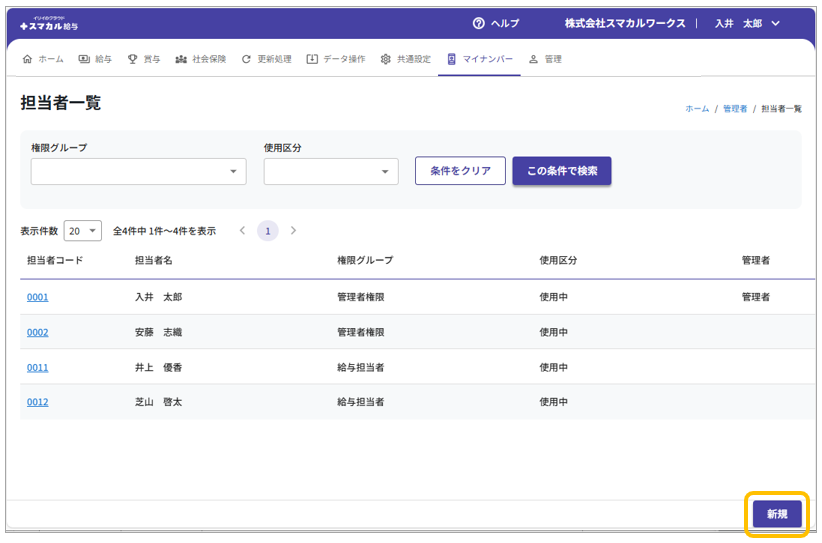 ①管理メニューから[担当者一覧]を開き、[新規]をクリックします。