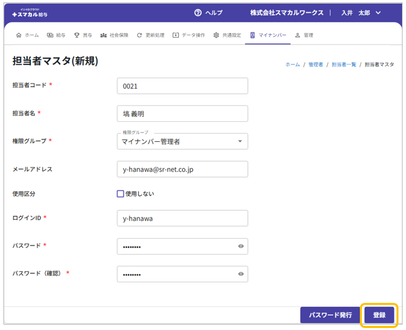 担当者コード ★ 担当者毎に付与するコードを入力します。他の担当者と同じコードは登録出来ません。