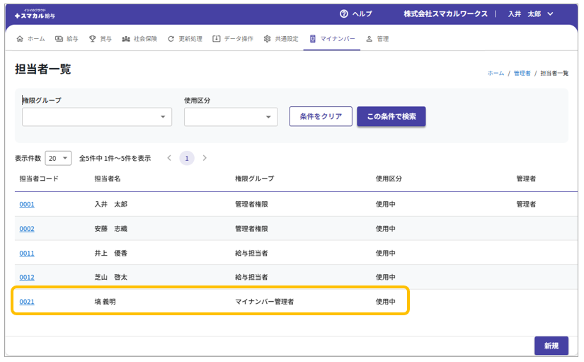 マイナンバー管理権限を持つグループに担当者を登録します。