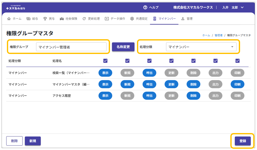 ③「検索一覧」「マイナンバーマスタ(編集)」「アクセス履歴」の権限を設定し、[登録]をクリックします。