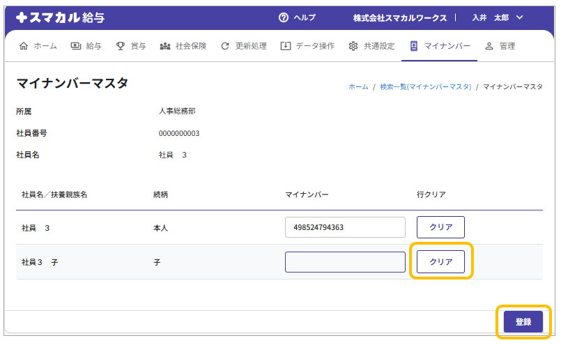 ③対象者のマイナンバー欄右側の[クリア]をクリックし、内容を確認後[登録]をクリックします。