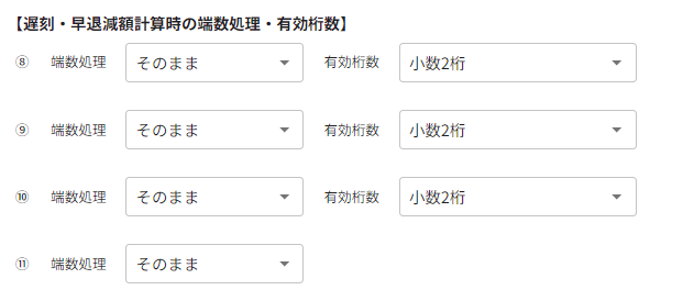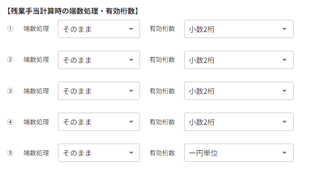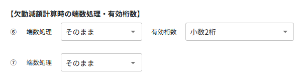 残業手当、欠勤減額、遅刻・早退減額の計算における端数処理と有効桁数を設定します。