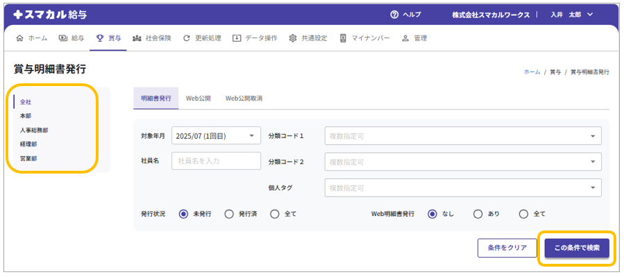 明細書発行を行う所属を選択し、後述の項目一覧を参考に条件を設定後[この条件で検索]をクリックします。