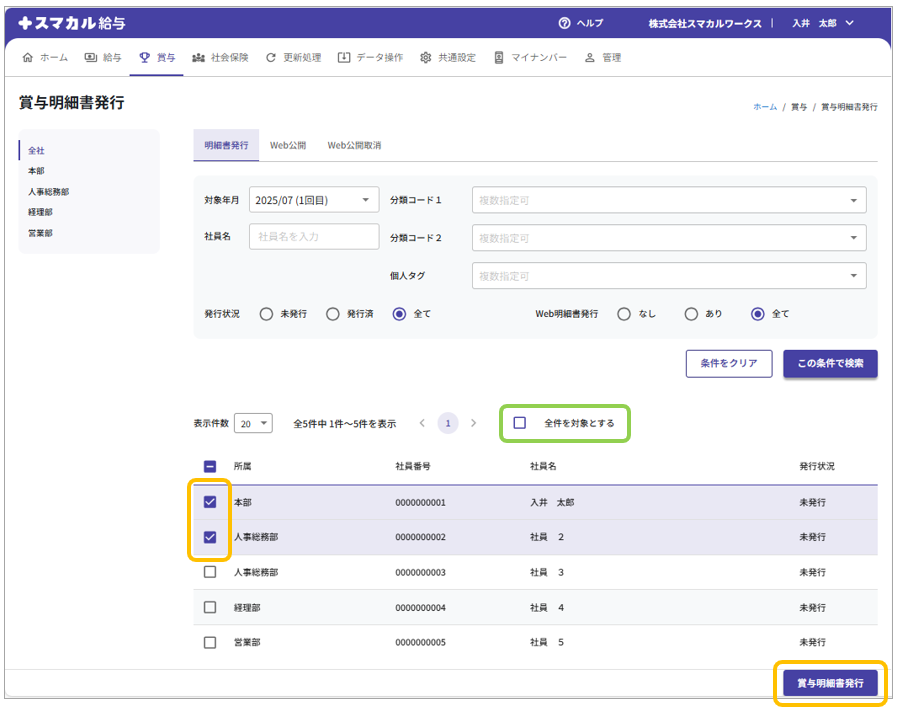 ②検索結果が表示されたら、発行対象の従業員にチェックを付けて[賞与明細書発行]をクリックします。