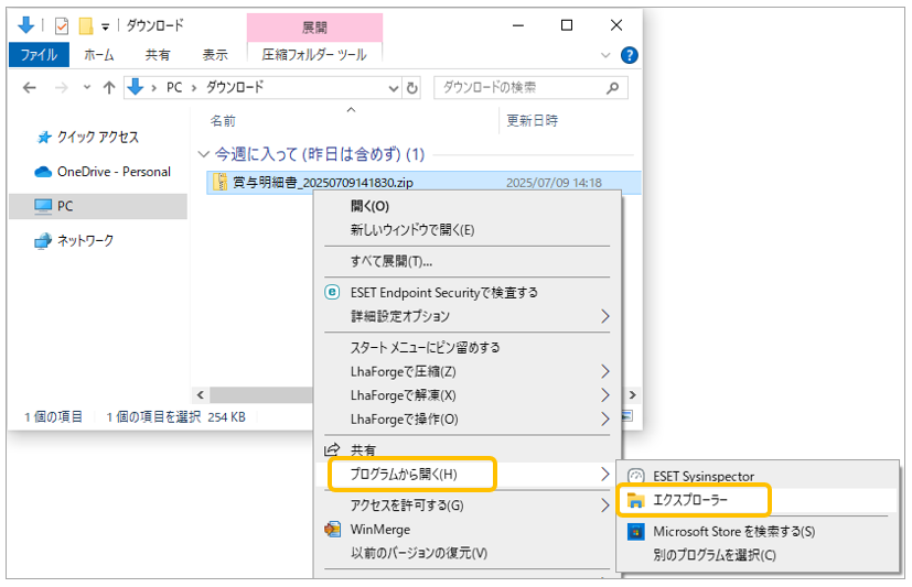 パソコンの環境によって展開したファイルが文字化けしている場合があります。その際は、ZIPファイルを右クリック →プログラムから開く→エクスプローラーの順に選択して内容を確認します。