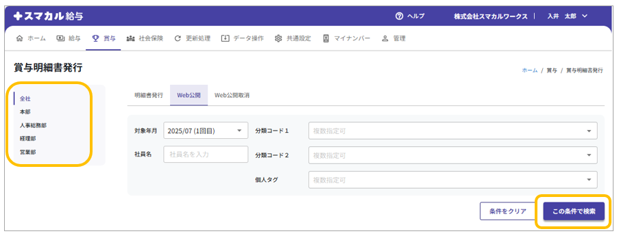 明細書のWeb公開を行う所属を選択し、従業員の検索条件を設定後[この条件で検索]をクリックします。