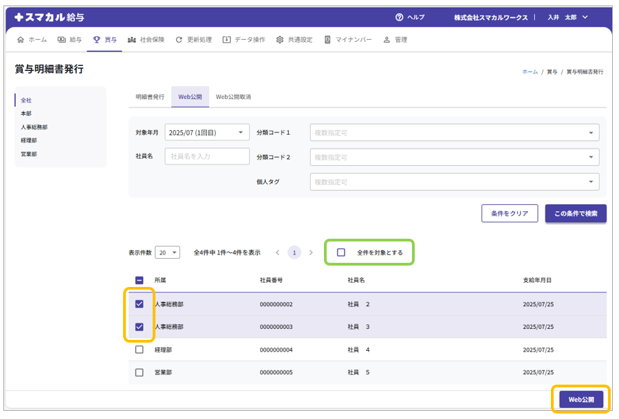 ②検索結果が表示されたら、発行対象の従業員にチェックを付けて[Web公開]をクリックします。