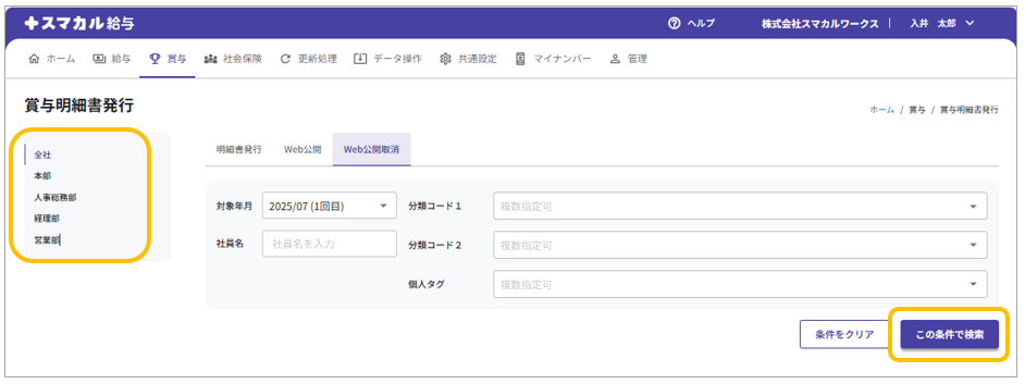 明細書のWeb公開取消を行う所属を選択し、従業員の検索条件を設定後[この条件で検索]をクリックします。