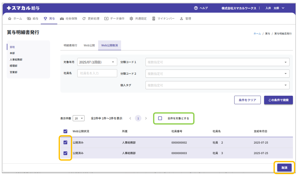 ②検索結果が表示されたら、取消対象の従業員にチェックを付けて[取消]をクリックします。