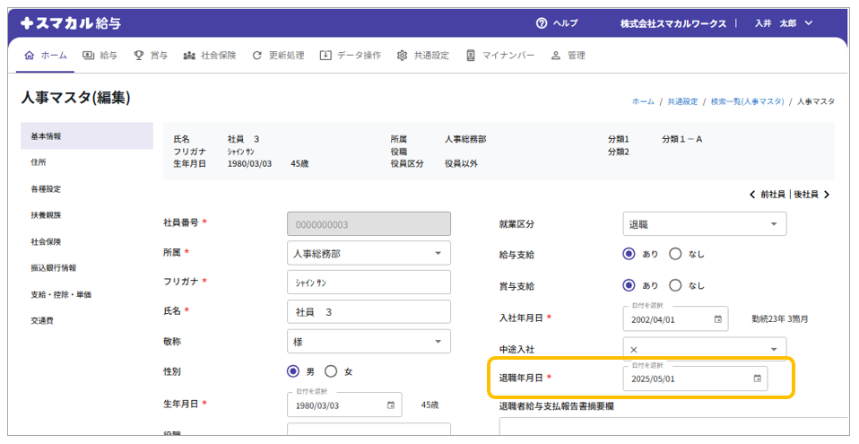 ②対象従業員の社員番号をクリックし、[人事マスタ(編集)]画面を開きます。