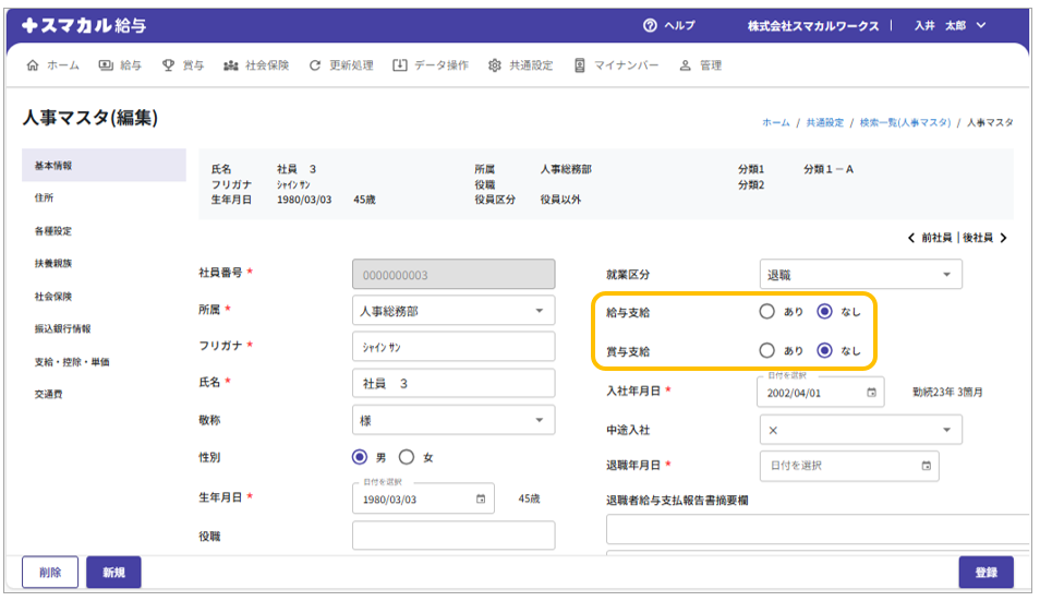 ③以降、給与・賞与の支給がない場合は、「給与支給」「賞与支給」をそれぞれ「なし」に変更します。
