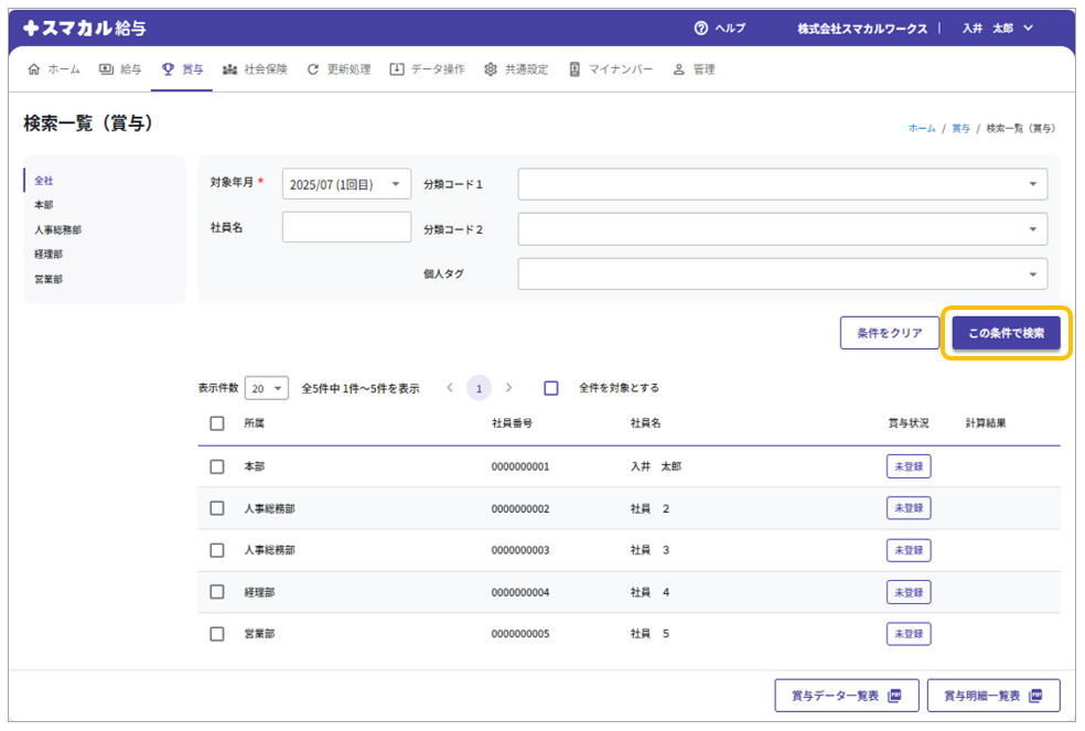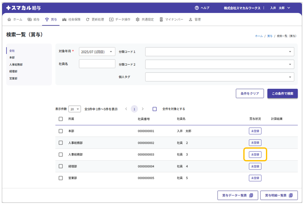 ②従業員の検索後、対象従業員行にある賞与状況欄の[未登録]をクリックします。