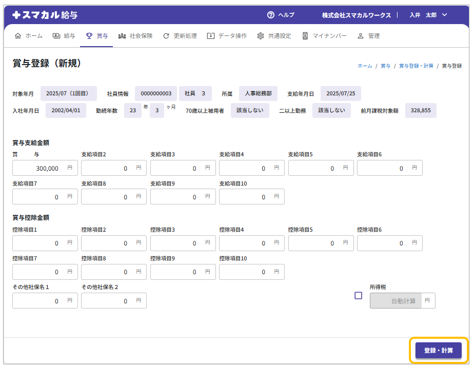 ③賞与登録(新規)で賞与データを入力し、入力内容に誤りが無いことを確認後に[登録・計算]をクリックします。
