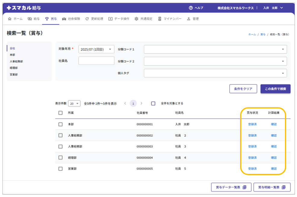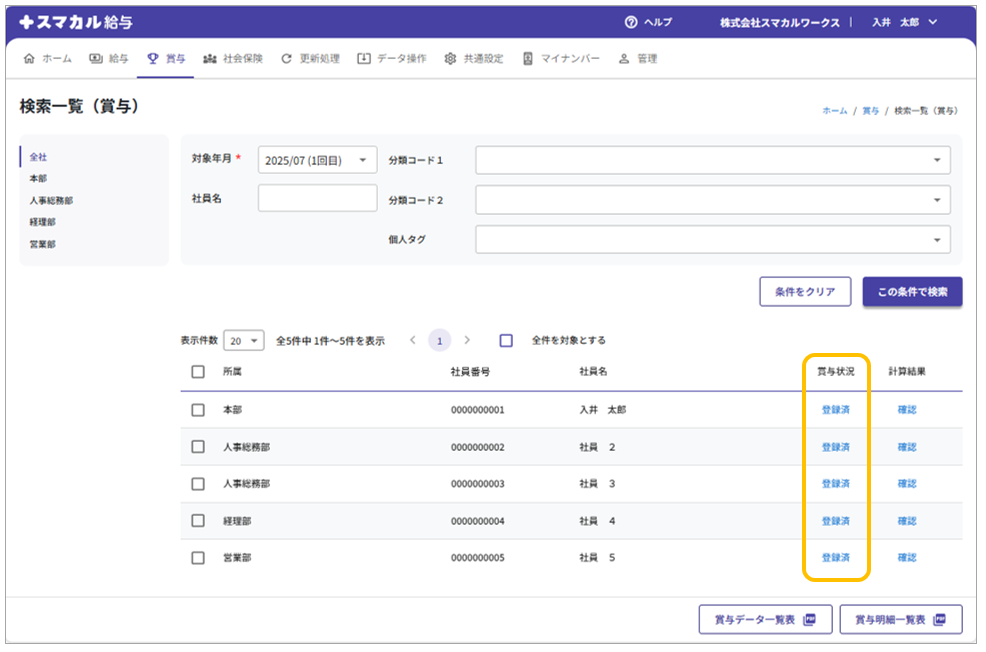 ②従業員の検索後、対象従業員行にある賞与状況欄の[登録済]をクリックします。