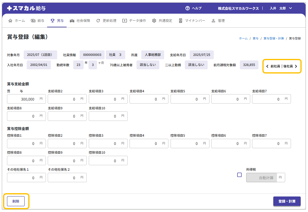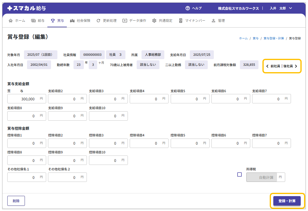 ③[賞与登録]で賞与データを修正し、[登録・計算]をクリックします。