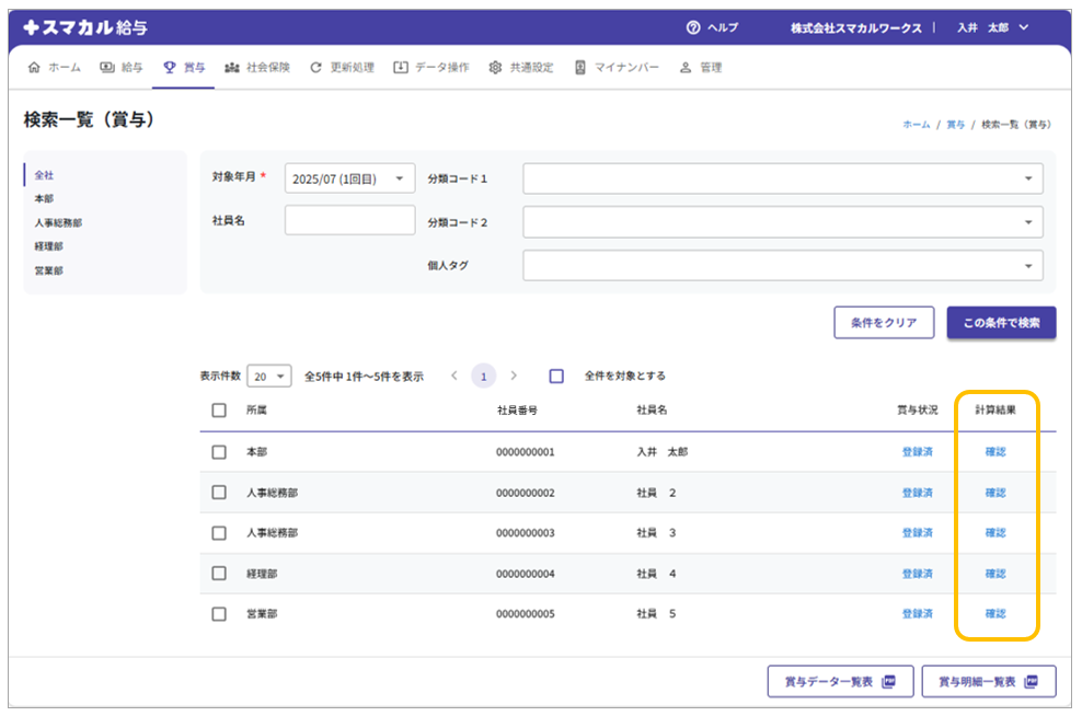 ②従業員の検索後、対象従業員行にある計算結果欄の[確認]をクリックします。