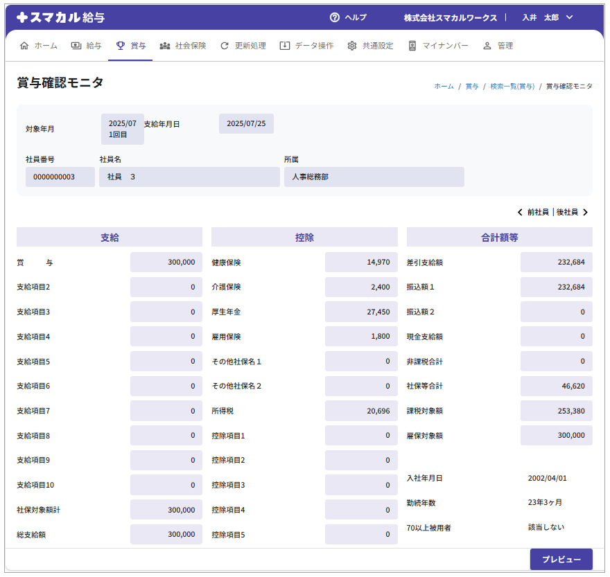 ④画面右下の[プレビュー]をクリックすると、賞与明細書のプレビューが表示されます。