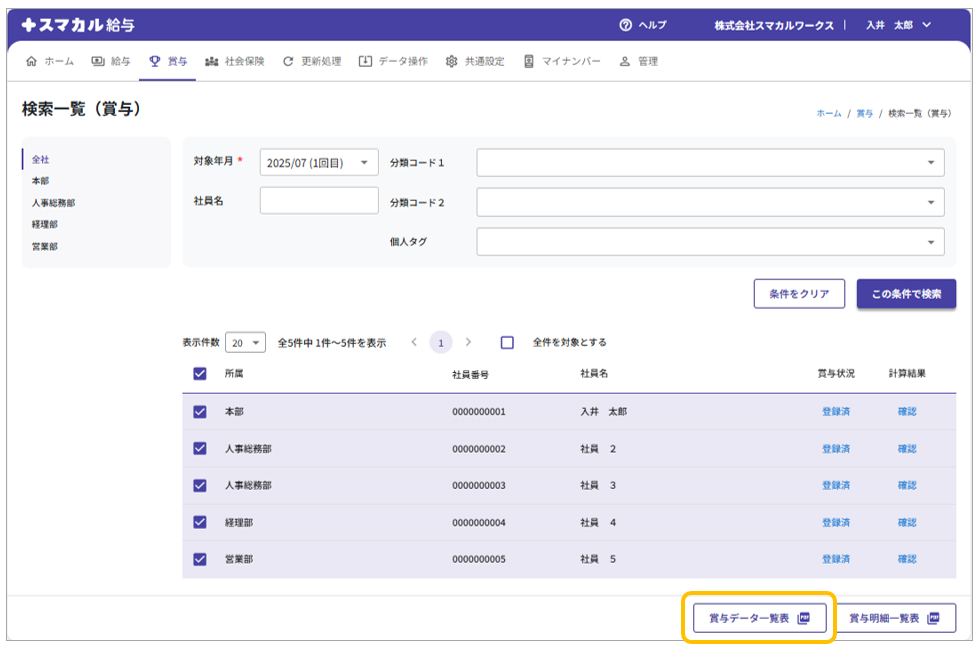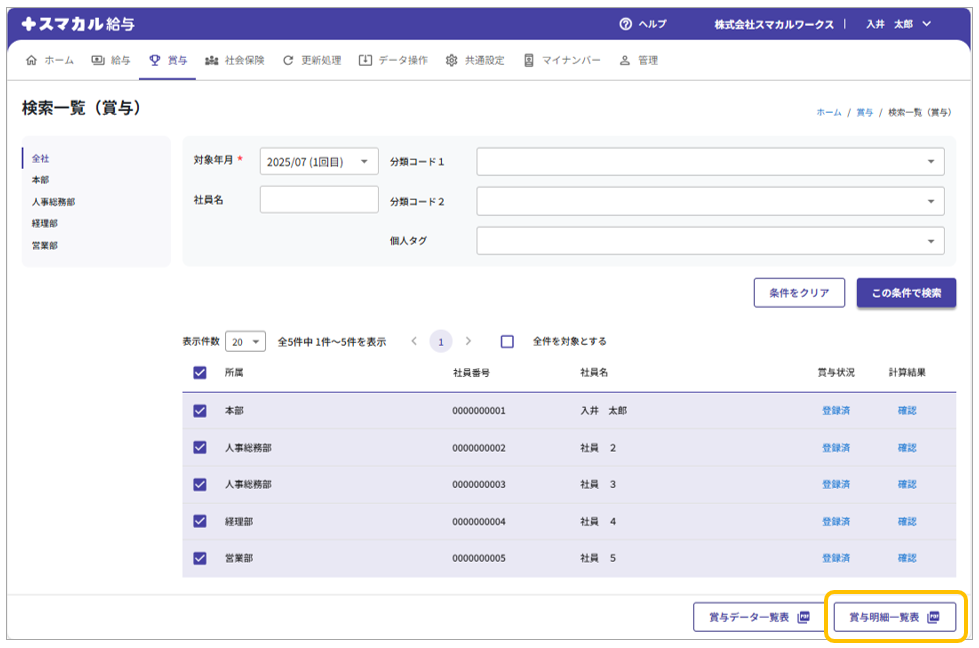 賞与一覧で入力や登録をした結果、計算された賞与計算悔過を一覧表で確認します。