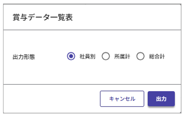 出力形態 | 出力の形態を指定します。※1枚当たり6名(列) ○社員別 従業員毎の賞与データと総合計を出力します。 ○所属計 所属毎に集計した賞与データと総合計を出力します。 ○総合計 賞与データの総合計のみ出力します。 |