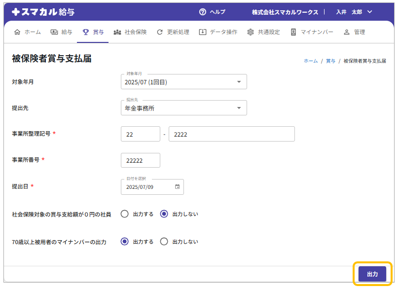 提出日 ★ | 被保険者賞与支払届の提出日を設定します。 ※初期値はシステム日付が表示されます。 |