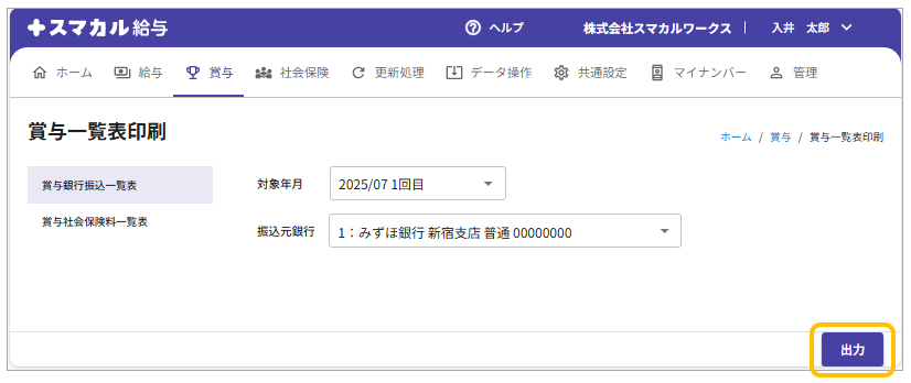 対象年月 | 出力したい対象年月を指定します。 ※初期値は賞与作成済みの一番新しい対象年月が表示されます。 |