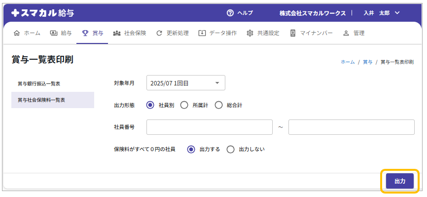 賞与一覧表印刷からPDF出力できる一覧表の出力方法を説明します。