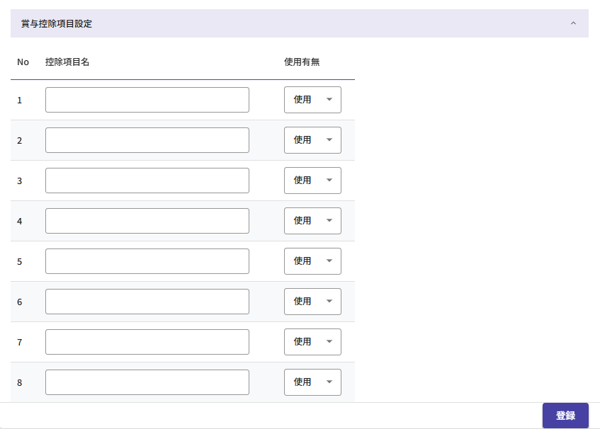 控除項目名 | 項目名を入力します。 ※全角半角合わせて、最大7文字まで入力可能です。 |