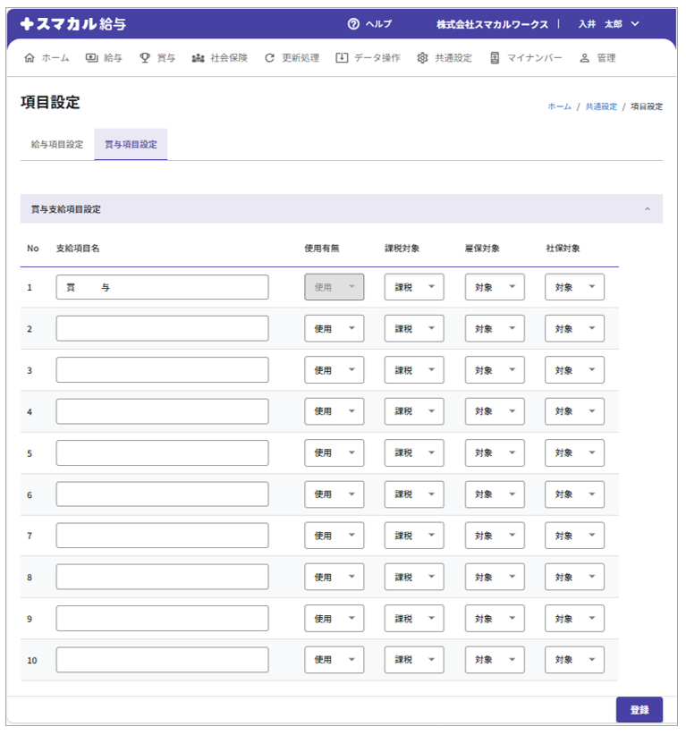 ②賞与支給項目設定の各項目で入力や選択をし、[登録]をクリックします。