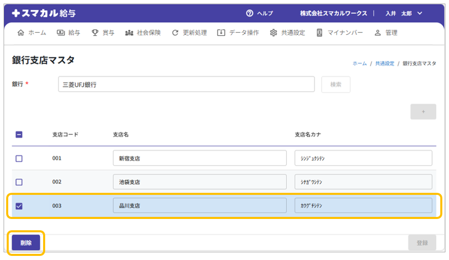 銀行支店マスタの削除