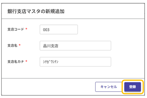 ②新規追加画面で「支店コード」「支店名」「支店名カナ」を入力し、[登録]をクリックします。