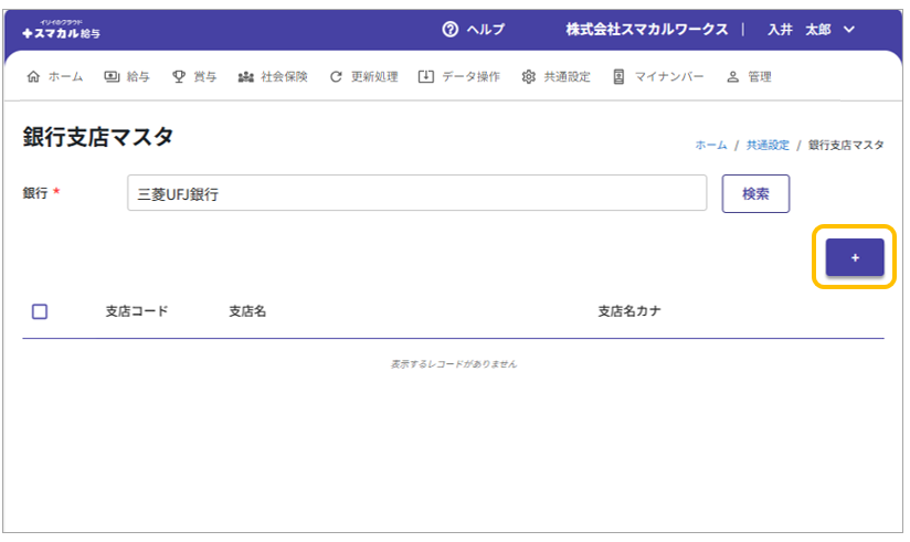 「銀行欄」で支店を登録する銀行を選択し、[検索]のクリック後に[+]をクリックします。