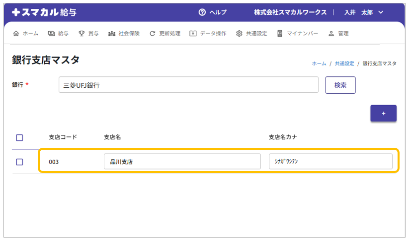 ここで登録した支店情報は、人事マスタの従業員振込先口座情報や、自社マスタの振込元口座情報で使用します。