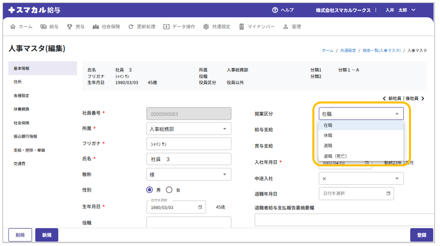 「基本情報」タブで「就業区分」を「在職」に変更し、[登録]をクリックします。