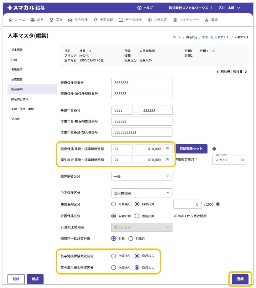 「賞与健康保険徴収区分」と「賞与厚生年金徴収区分」を「徴収なし」に変更し、[登録]をクリックします。