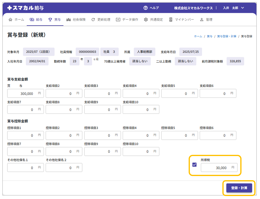 所得税欄にチェックを入れて金額を入力し、「登録・計算」をクリックします。