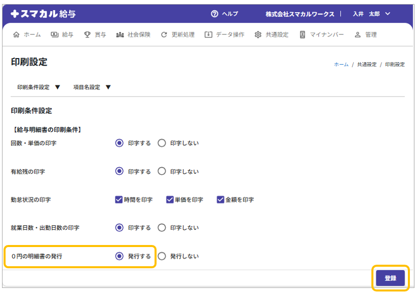 「0円の明細書の発行:発行する」を選択し、[登録]をクリックします。